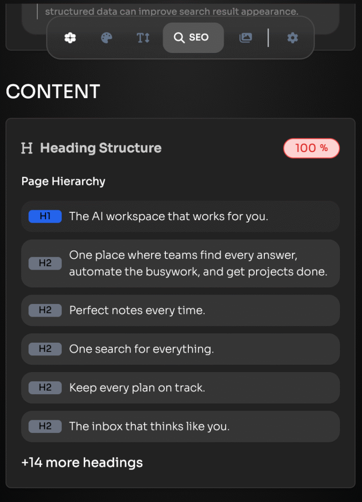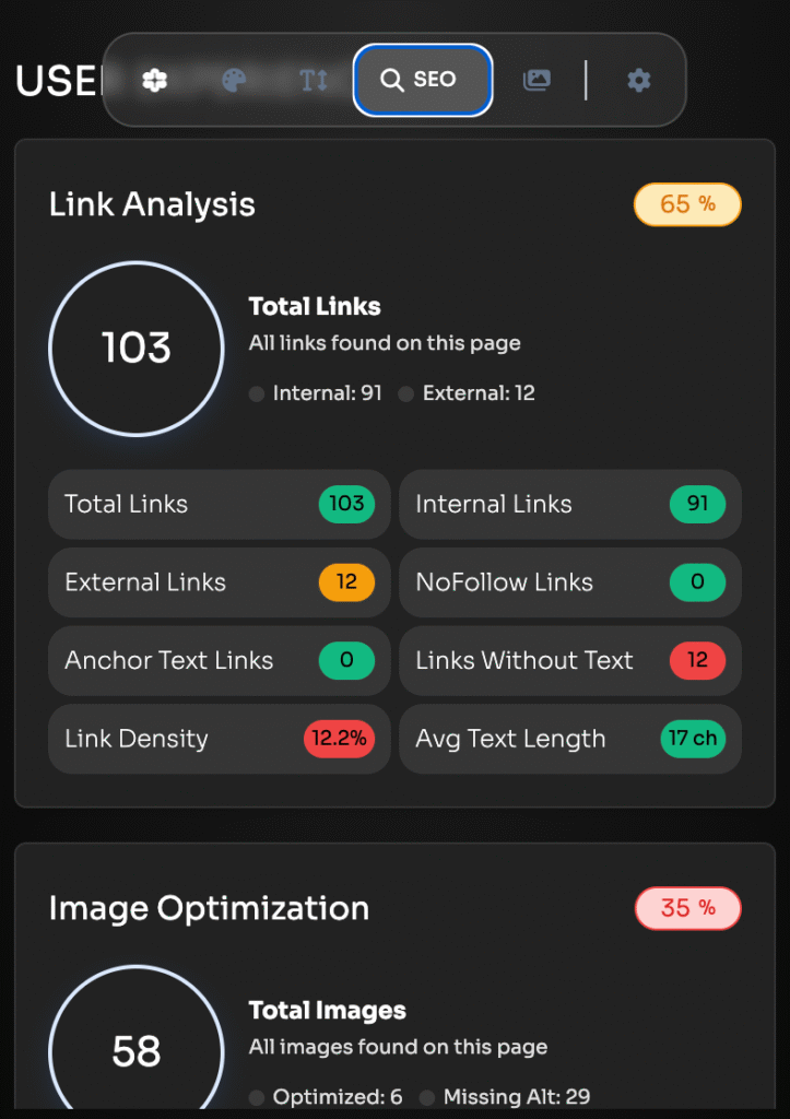 The UI unifies color extraction, typography analysis, SEO optimization, and media management in one streamlined popup with smart expandable tabs.